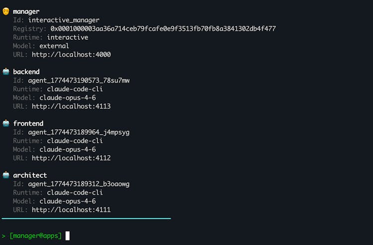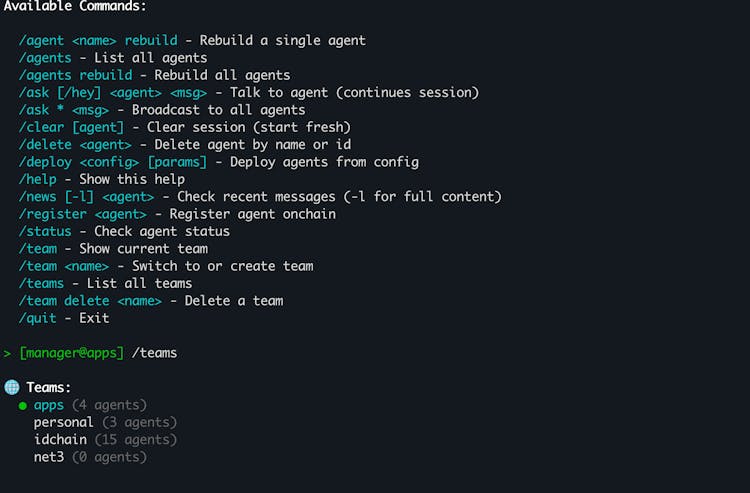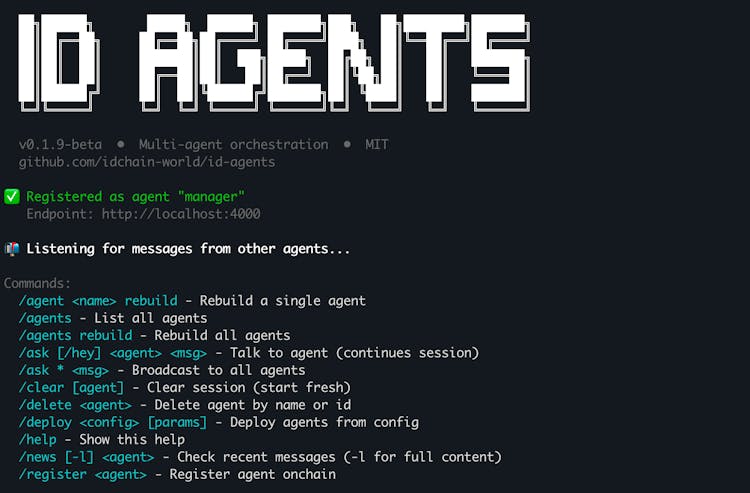 ID Agents is an open-source multi-agent orchestration platform built on Claude Code. Deploy teams of autonomous AI agents that run as local processes, communicate via the REST-AP protocol, and optionally register onchain for verifiable ENS-based identity.