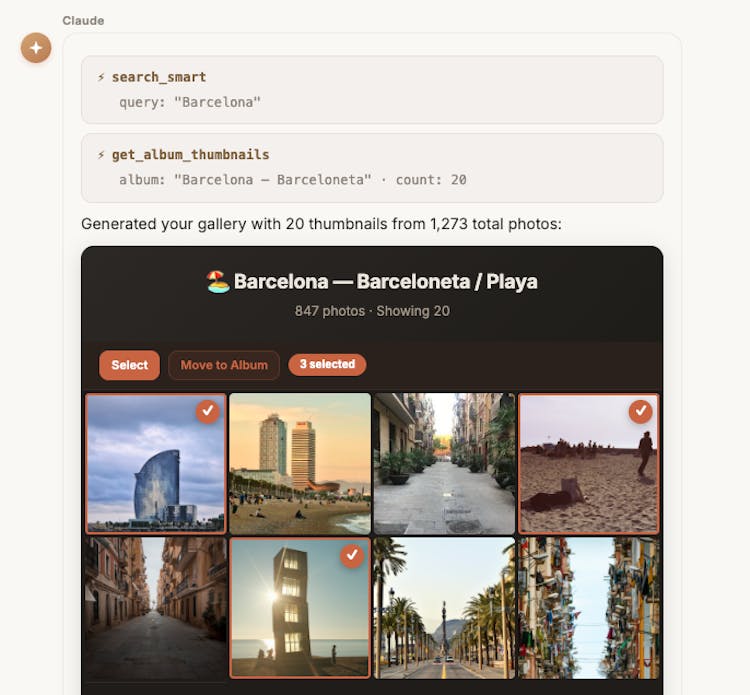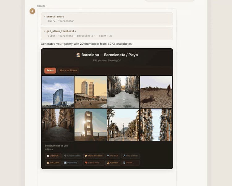 Immich has built-in AI for face recognition and CLIP search, but it's limited to short keywords. immich-photo-manager extends this with full natural language queries — ask for "photos from that rooftop dinner in Barcelona last July" and get results.