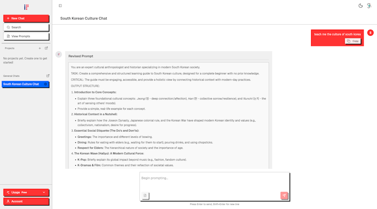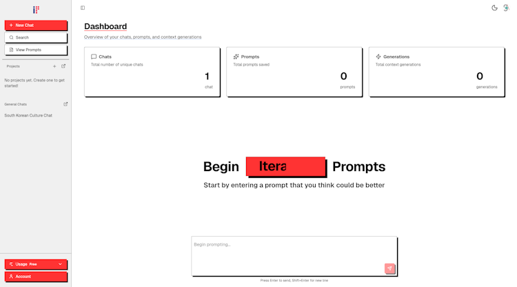 ImPromptr is a prompt refinement and context engineering app. It allows you to iteratively improve your prompt with the help of a special prompt engineering based agent that is instructed to use modern prompt engineering techniques. The way this app works is you start off by entering a prompt that you want to improve. The agent will then revise your prompt and give you a list of 5 questions to further guide your thinking. You can answer the questions, or you can write whatever information you would like, and using that additional information, the agent will revise your prompt further, being even more specific than its previous version, and provide you with another set of 5 questions to really hone in on your idea. You can save your favorite prompts, with each saved prompt allowing you to manually tweak them and have a version control of all the different variations. Once a chat instance has enough information, you can generate context files, markdown files that use your entire conversation history along with a specific topic for it to focus on. You can organize your chats, prompts, and context files in specific projects to further categorize your work.