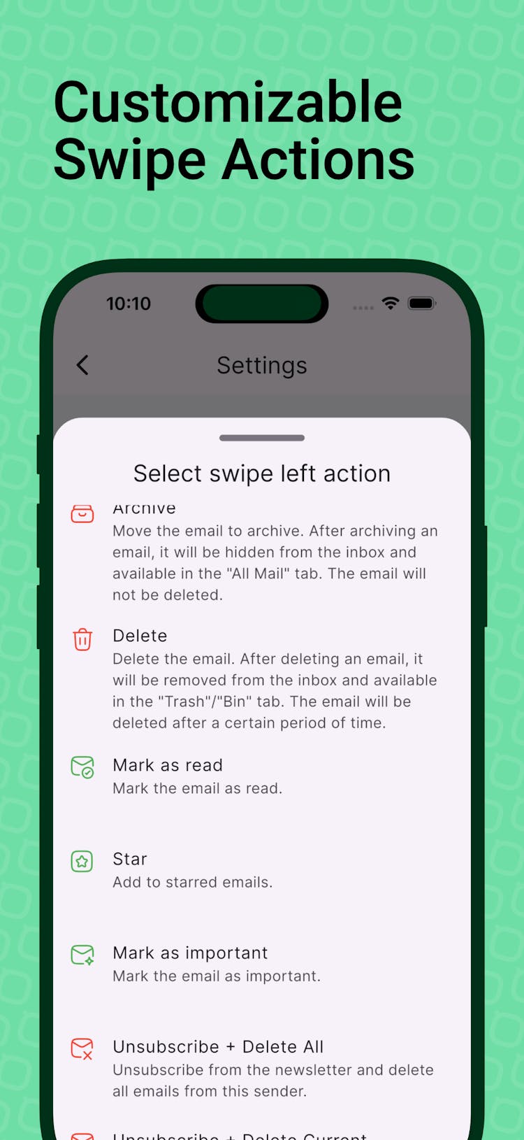 Not a fan of the default actions? No problem! **InboxSwipe lets you fully customize your swipe gestures** to match your workflow. Choose from the following actions and assign them to any swipe direction: