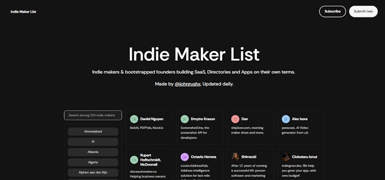 A curated list of indie makers and bootstrapped founders building SaaS, apps, and directories independently.