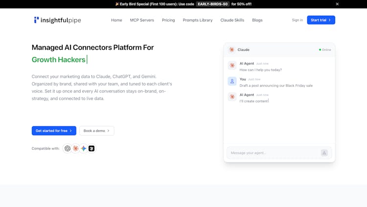 Marketing analytics platform that connects ad and analytics data to AI tools such as ChatGPT and Claude. It integrates with sources such as Meta Ads (Facebook/Instagram), Google Ads, Google Analytics 4 (GA4), and TikTok Ads, and other channels. Teams can ask questions in plain language and get cross-channel insights. Clients can be organized into brand-specific spaces with role-based access and a centralized dashboard for accounts and campaigns. Custom AI personas help keep outputs aligned to each brand’s tone and guidelines. Common workflows include campaign audits, optimization suggestions, and budget pacing. Insights can be exported as charts and documents (PDF/slide-ready), and multilingual support helps teams share results across regions.