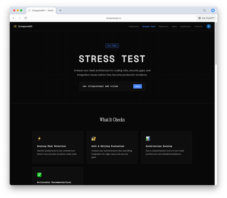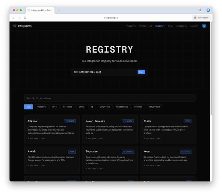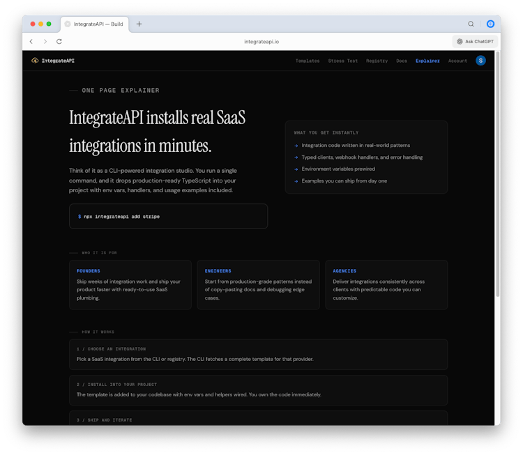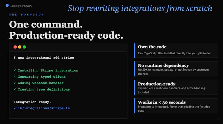 Run `npx integrateapi add stripe` and get a full production-ready integration installed directly into your Next.js app — typed client, webhook handler, error handling, and env setup included.