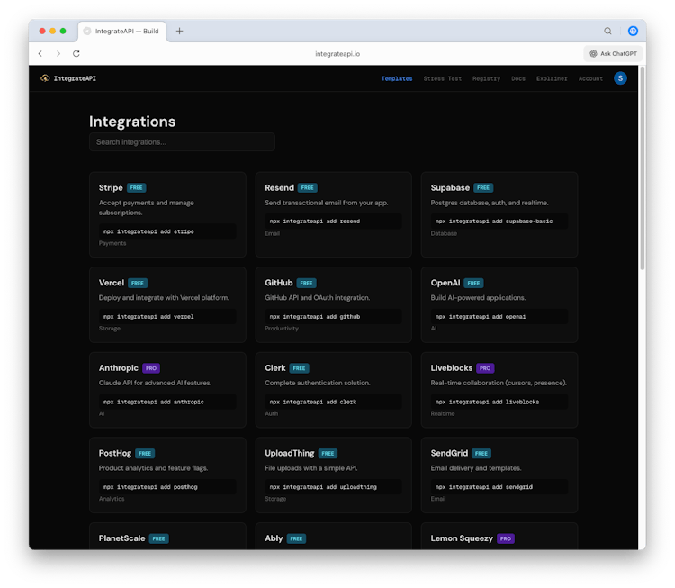 18+ integrations including Stripe, Supabase, Clerk, OpenAI, and more. Free tier available.