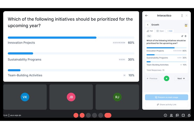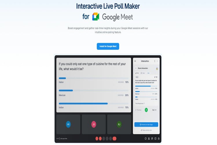 Interactico is a tool designed to enhance Google Meet meetings by making them more interactive. It allows users to add polls, quizzes, Q&A sessions, and word clouds to their meetings. Participants can join activities via a shared link, without needing to install any add-ons. The platform offers features like real-time feedback and analytics to help users make informed decisions during and after meetings. Interactico offers different pricing plans, including a free plan and paid options with more features.