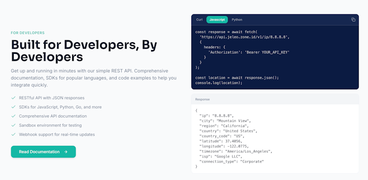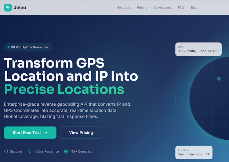Jeleo is an enterprise-grade IP geolocation and reverse geocoding API that delivers precise, real-time location data from IP addresses and GPS coordinates. It powers fraud detection, personalization, and analytics with sub-50ms responses and global coverage across 195+ countries. Start with a 5-day free trial on plans from $10/mo. Perfect for fraud prevention, ad targeting, and UX personalization.