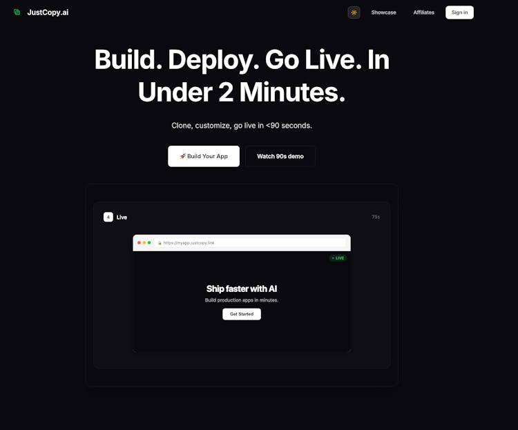 JustCopy.ai turns any idea into a live, customizable website in under 2 minutes. Simply describe what you want, copy an existing site, or mix both — the platform instantly generates, edits, and deploys production-ready web apps with no setup required.