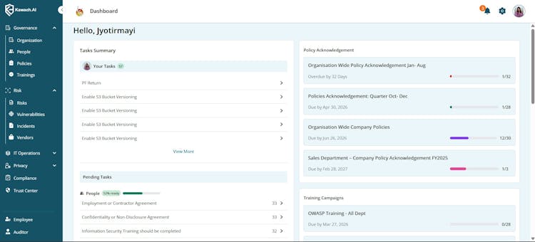 Kawach.AI is a comprehensive tool for ISO 27001, SOC2, DPDP, GDPR, HIPAA Compliance. It brings everything into one platform to manage privacy management, DSAR management, consent and cookie management, data governance, vendor management, cloud security posture management, people management, and audit management. It also provides a Trust Centre to help companies demonstrate compliance, build transparency, and earn customer trust.