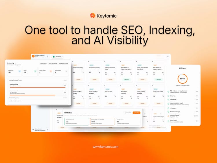 Keytomic is your AI-powered SEO and AEO platform, automating organic dominance across Google, ChatGPT, Claude, and Perplexity. Effortlessly win high-intent keywords through smart research, generate and publish LLM-optimized, context-rich content straight to your site, spot SEO health issues with one-click audits, build authority via backlink analysis and Reddit mentions, and track AI visibility in real time, all from a single dashboard. Brands, startups, and SMEs win at AI visibility, without the manual hassle.Key Features