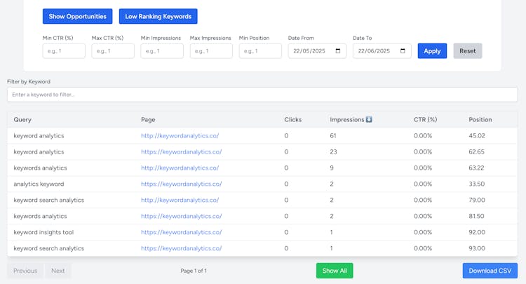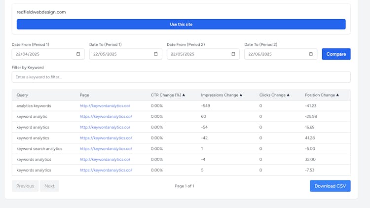This tool pulls all your GSC keyword data into one simple, unified view — so you can instantly see what’s ranking, what’s dropping, and where the quick SEO wins are.