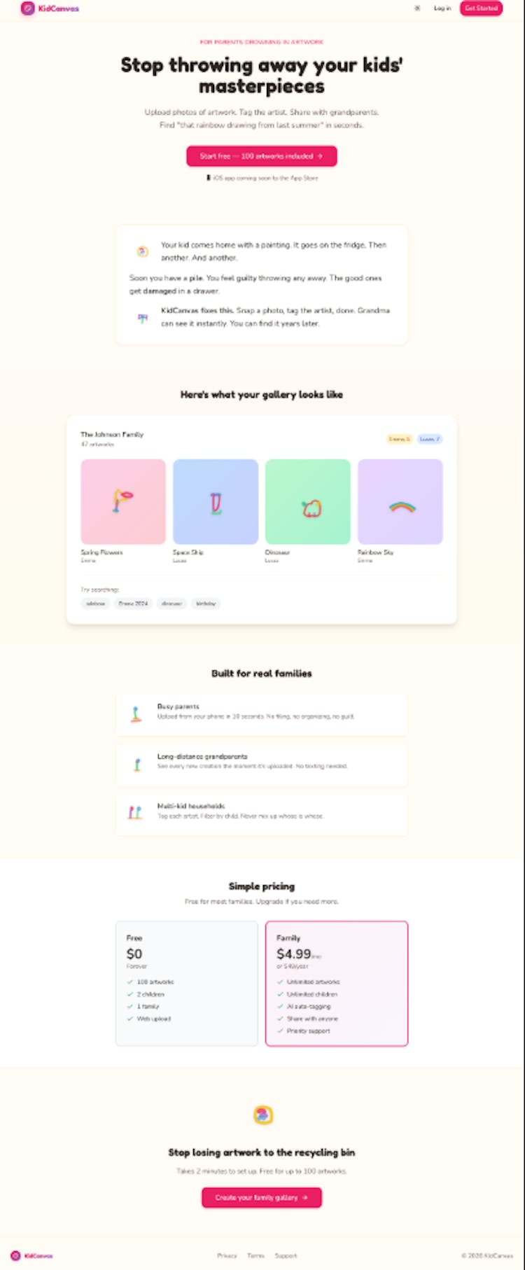 KidCanvas is a family-focused digital gallery that solves the problem every parent faces: what to do with all your children's artwork. Your kids bring home paintings, drawings, and crafts every week. They pile up on the fridge, then in drawers, and eventually you're left with a mountain of paper. You feel guilty throwing anything away, but keeping everything isn't realistic—and the best pieces often get damaged or lost. KidCanvas changes that. Simply snap a photo of any artwork, tag it with the child's name, add a title, and it's instantly saved to your family's digital gallery. Smart scanning technology automatically detects and enhances artwork, making each piece look its best. The entire family can access the gallery—grandparents, aunts, uncles, and other family members can see new artwork as soon as it's uploaded. No more mailing photos or trying to remember which drawing was whose. Search makes it easy to find "that rainbow drawing from last summer" in seconds. Key features include: - Smart artwork scanning that automatically detects and enhances artwork - Family sharing so grandparents and extended family can see artwork instantly - Artist tagging to organize pieces by child - Searchable gallery to find specific artwork quickly - Collections to organize artwork by theme, event, or time period - Favorites to highlight the best pieces - Mobile-friendly web app with iOS app coming soon KidCanvas helps you preserve every masterpiece without the clutter. Start with 100 free artworks, then choose a plan that fits your family's needs. Stop feeling guilty about throwing away artwork—save it all digitally instead.
