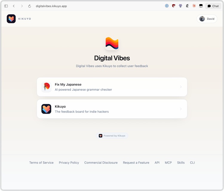Kikuyo (kikuyo / 聞くよ / Japanese / "I'm listening.") is a feedback tool for indie hackers and small teams shipping multiple products. Each app gets its own public board for requests and upvotes, while you manage everything from one workspace.