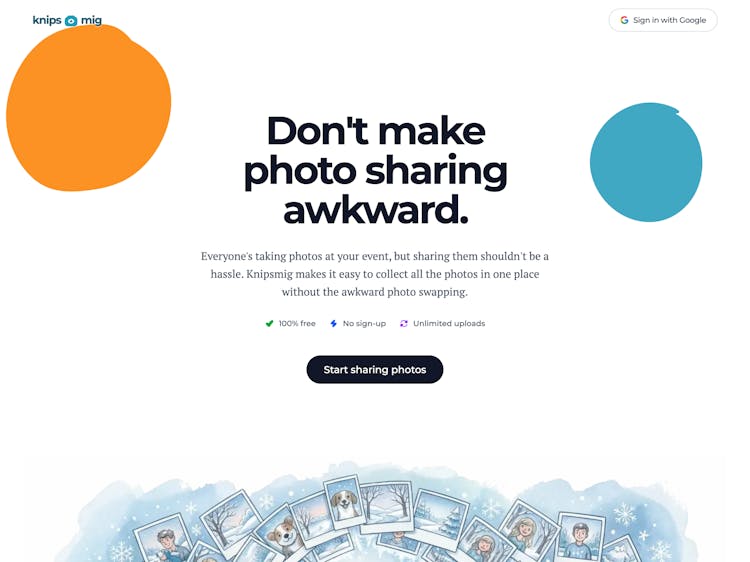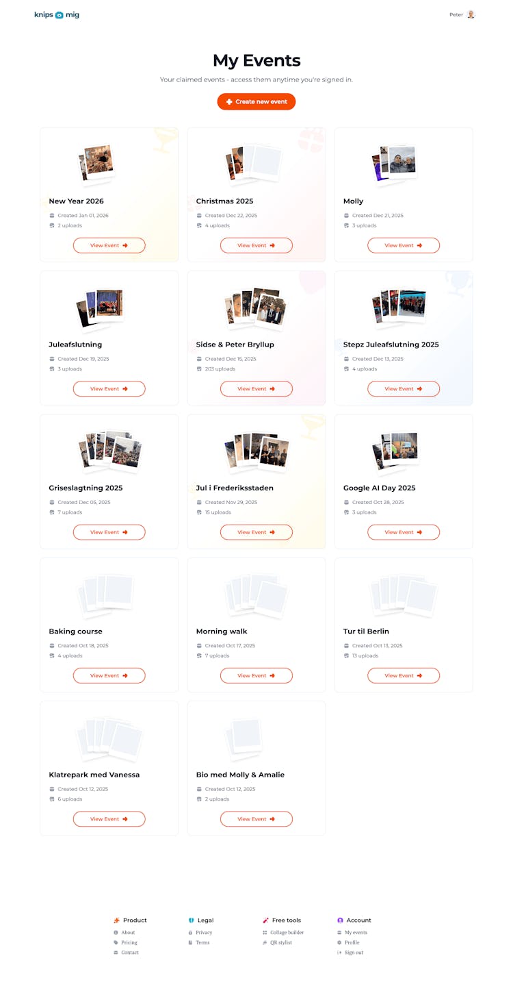 Knipsmig lets event hosts collect photos from all guests in one shared album. Guests simply scan a QR code to upload — no app download, no account required. Perfect for weddings, parties, and corporate events.