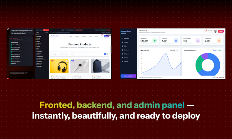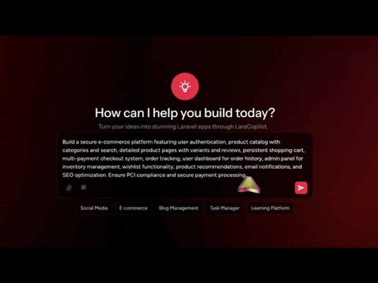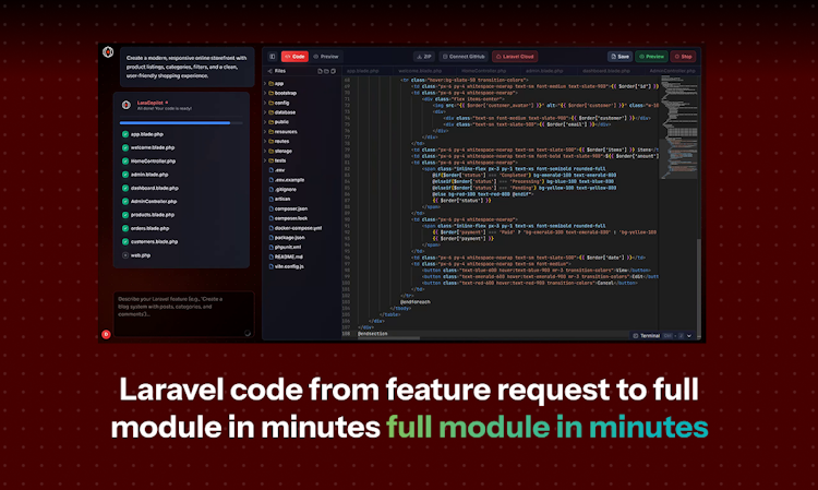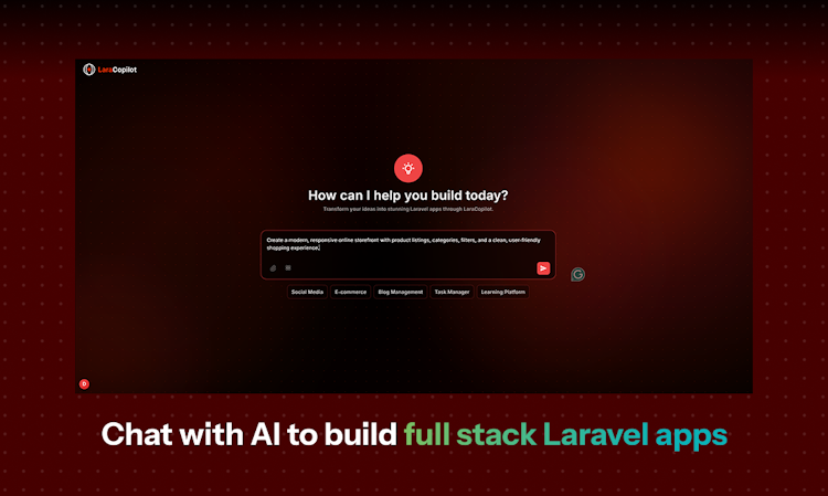 LaraCopilot is the world’s first Laravel AI Full Stack Engineer. It turns your idea into a full stack Laravel app in minutes with clean code, database setup, migrations, admin panel, GitHub sync, and one-click deploy. No lock-in. Built 100% with Laravel.