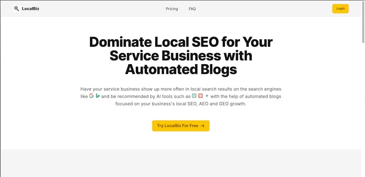 LocalBiz is an AI-powered platform that helps service businesses grow local SEO by generating location-focused blog content.