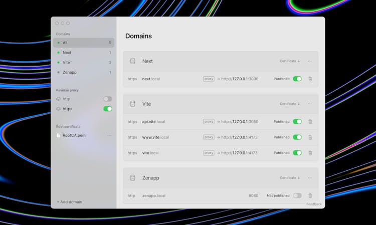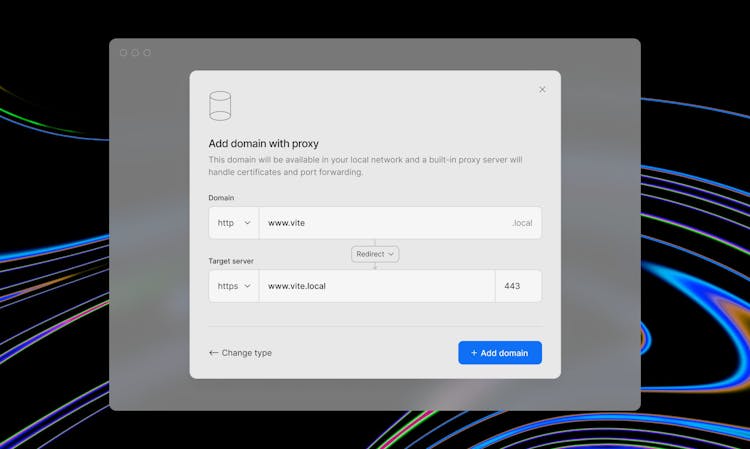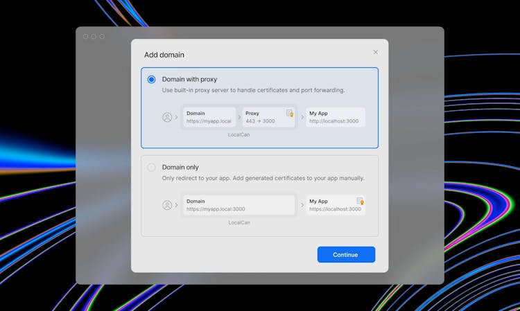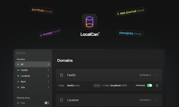 Publish .local domains and public preview URLs. Forget about creating HTTPS certificates manually 😩, remembering port numbers and IP addresses 😢, or editing /etc/hosts 😭! All of this is handled by LocalCan, so you can focus on you app and not the setup.