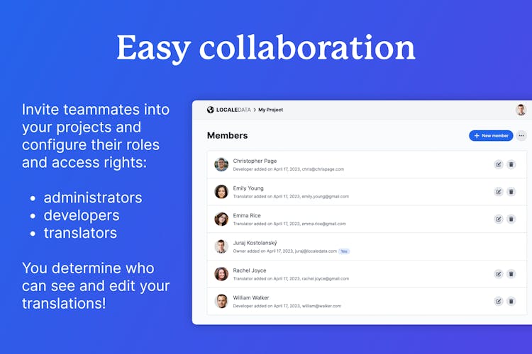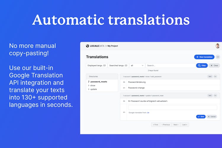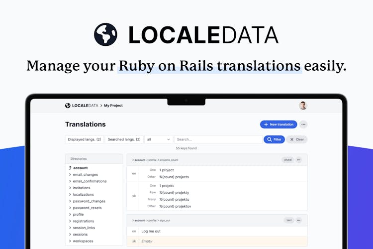 LocaleData is a simple translation management platform that helps you work on your YAML translation files through a web interface - even with your non-technical teammates. Upload your existing translations, invite your translators, export the results.
