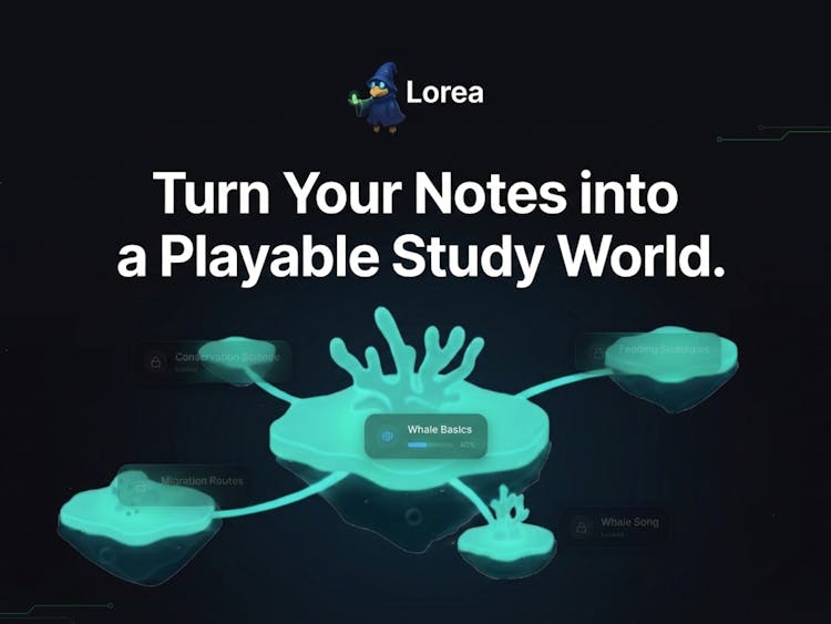 Lorea is an AI Study Game Generator that lets you create entire study worlds from a single prompt, set of notes, or PDF. Instead of static flashcards or slides, Lorea builds interactive game experiences where students progress through islands, nodes, and challenges tailored to their subject and level.