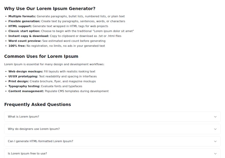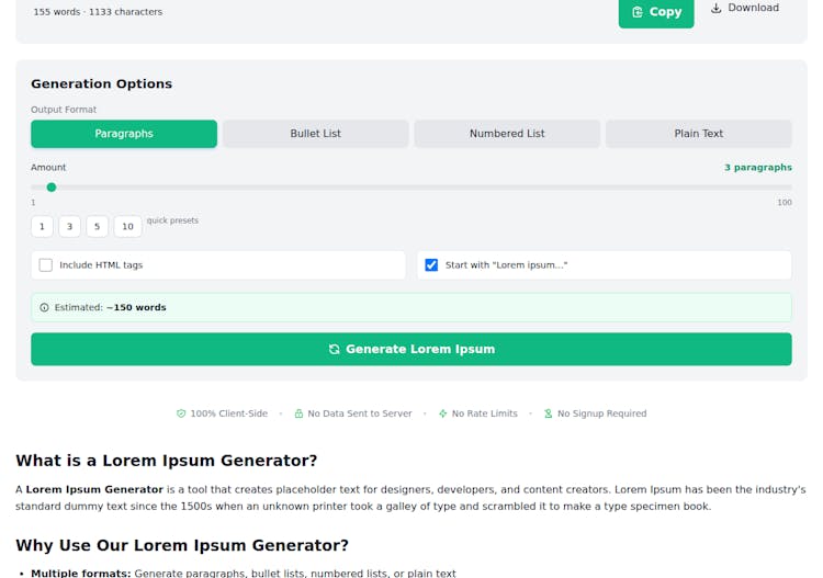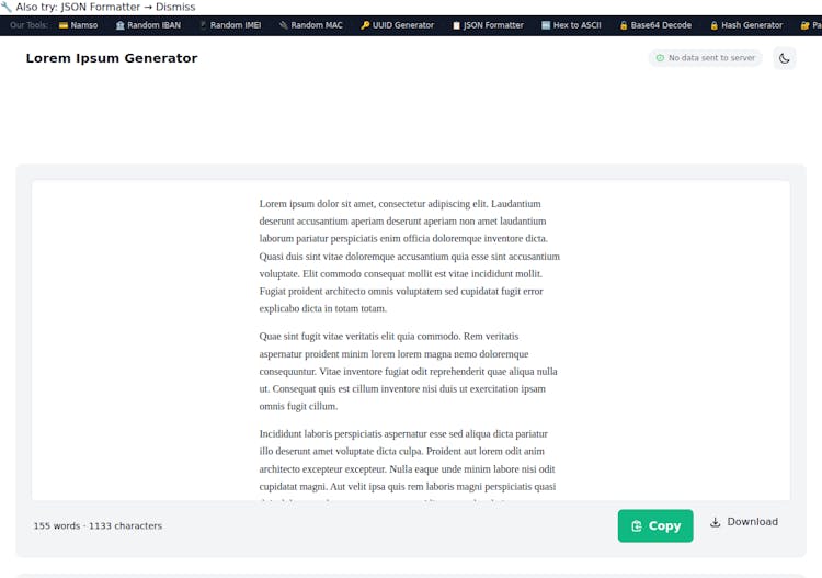 Generate lorem ipsum placeholder text for design and development. Paragraphs, sentences, words, or custom lengths.