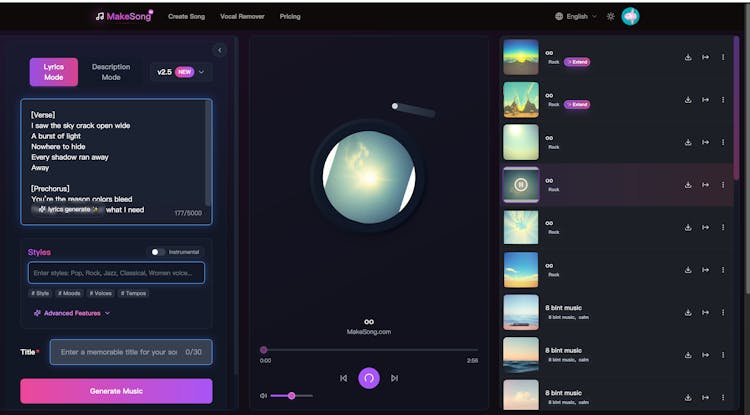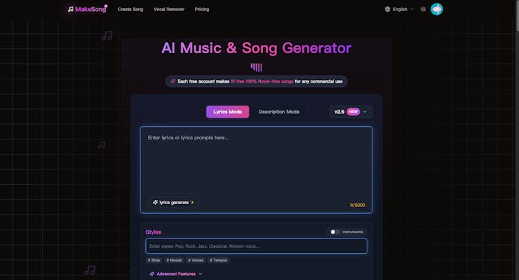 MakeSong is an all-in-one AI music generator(https://www.makesong.com/)—create free 100% Royal-free songs,extend songs, ai covers, separate vocals, and ai mastering instantly. Get 10 free songs to use across YouTube, TikTok, Shopify, and more.