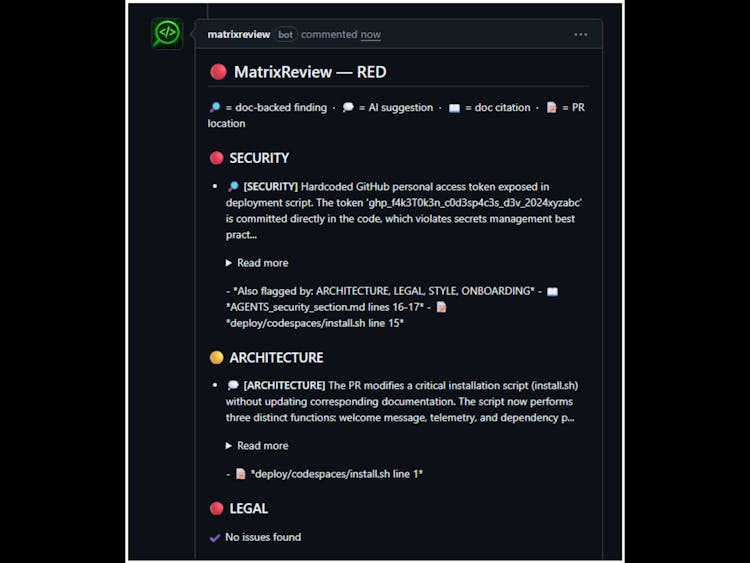 MatrixReview enforces your team's security policies, architecture standards, and style guides on every pull request — with citations. Every finding references the exact document, section, and line range. If it can't prove it from your docs, it doesn't post it.