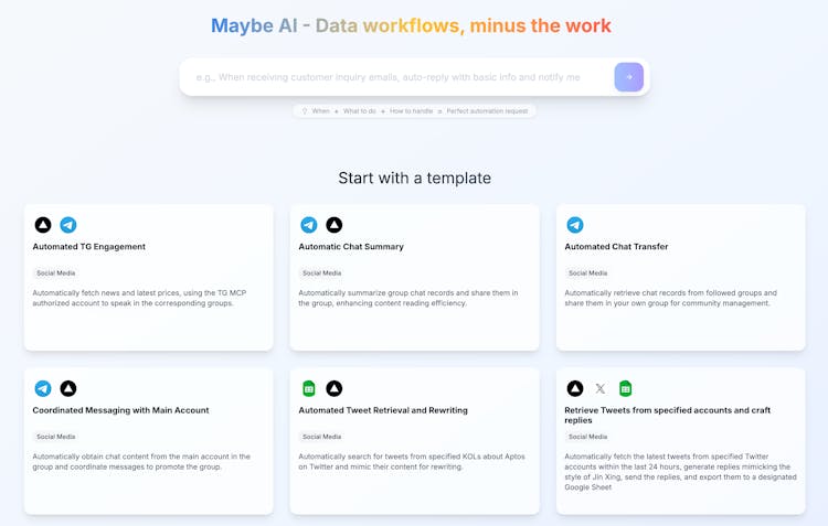 MaybeAI is a business data workflow automation platform that lets prosumers describe their data needs in natural language and automatically handles the complete "acquire → analyze → act" business cycle, with intelligent solutions that learn and evolve with each use.