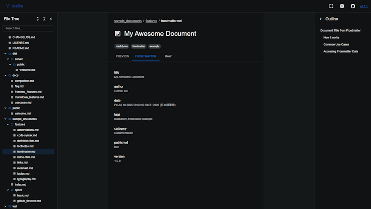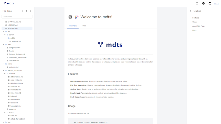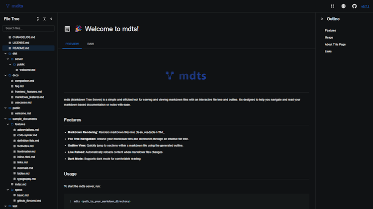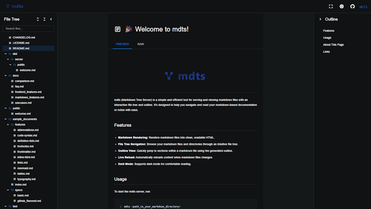 mdts is a zero-config CLI tool that serves your local Markdown files in a clean, navigable browser UI. Perfect for developers, writers, and anyone previewing Markdown. Run npx mdts and instantly explore your docs—no build, just beautiful rendering.
