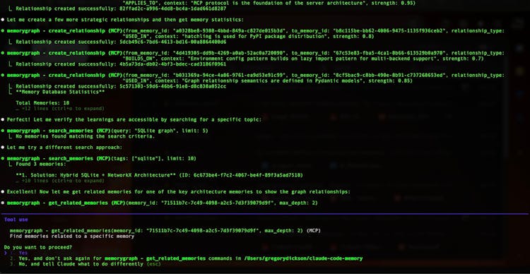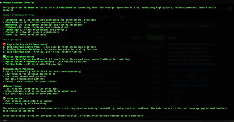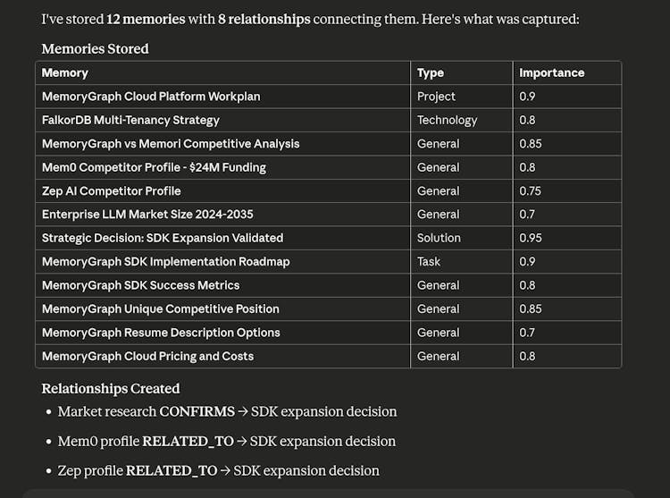 Graph memory captures entities, relationships, and temporal markers that traditional vector stores miss. For example: Alice COMPLETED authentication_service, Bob BLOCKED_BY schema_conflicts with timeline information about when events occurred.