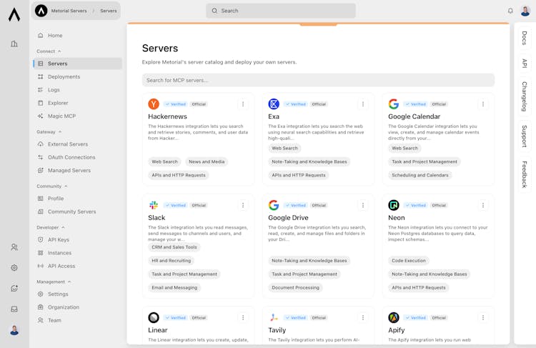 The open-source MCP platform that gives AI agents 600+ integrations out of the box. Deploy servers in 3 clicks, we handle OAuth (including token refresh), security, and scaling automatically. Python and TypeScript SDKs included. Build agents that actually do things, in days, not months.