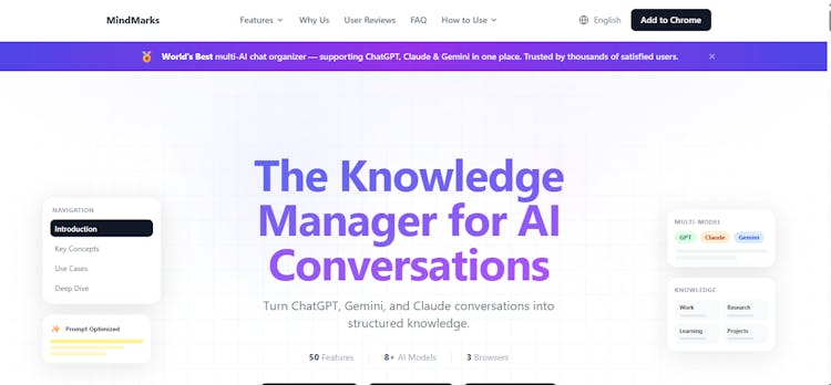 MindMarks is an AI productivity tool that turns long, messy AI conversations into structured, reusable knowledge. It helps users organize, search, and revisit chats across ChatGPT, Claude, and Gemini with features like folders, search, prompt management, exports, and better navigation. It is built for power users, researchers, students, and professionals who want to get more long-term value from their AI workflows. Key features: 1. Folders for organizing AI chats 2. Search across past conversations 3. Prompt management and reuse 4. Auto-generated chat outlines 5. Export to multiple formats 6. Better navigation for long threads 7. Cross-platform support for ChatGPT, Claude, and Gemini 8. Structured knowledge capture from messy chats