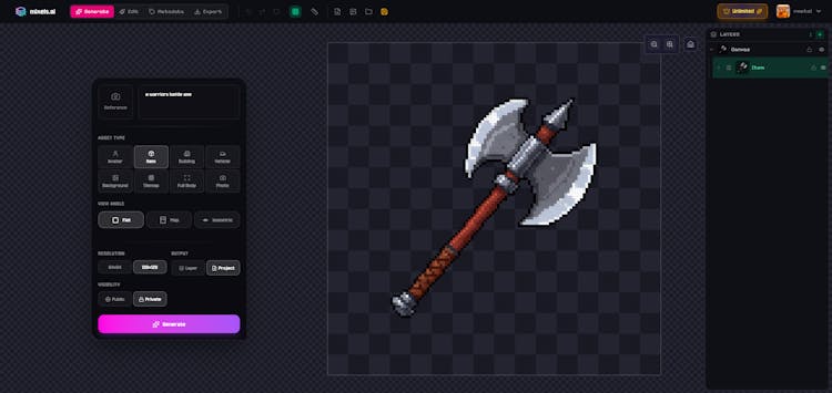 Generate pixel art avatars, items, and game assets from a text prompt or use a reference photo to convert a picture to pixel art. Choose 64x64 or 128x128 resolution with isometric and 2D flat views. The AI pixel art generator produces clean, grid-aligned results every time — a true free sprite maker and ai game asset generator in one.