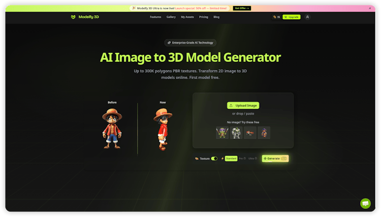 Transform any image to 3D models instantly with our advanced AI image to 3D generator. Convert 2D images to 3D models in seconds - free online tool for 3D printing, games, and professional projects.