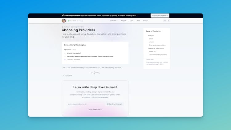 Devs who create content want to have a site to share thoughts with the world. Atm, there's no "perfect solution" for this. Devs have to build from scratch, use a design template & code features, or use a CMS/no-code tool. This starter includes analytics, newsletter, modern tooling & design, and more.