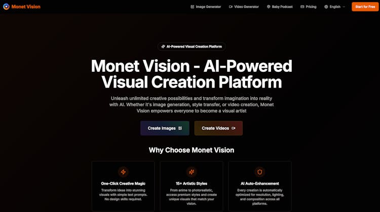 Monet Vision is the world's leading AI-powered visual creation platform, offering a comprehensive suite of intelligent tools for image generation, video creation, and visual editing. Transform your ideas into stunning visuals with cutting-edge AI technology.