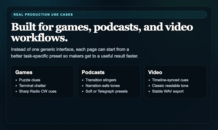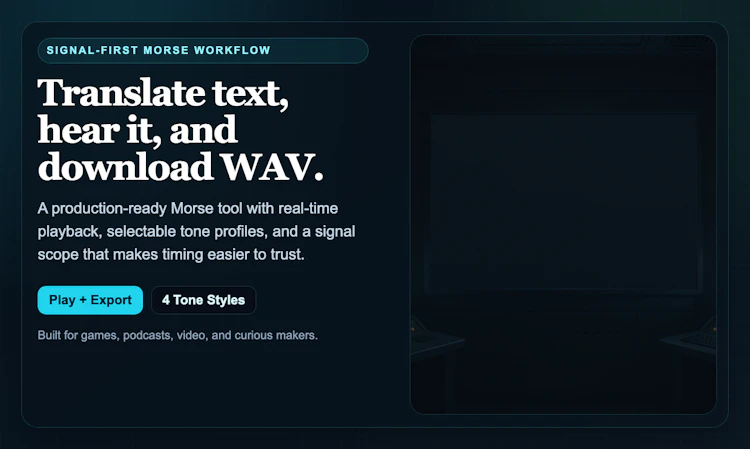 Convert text and Morse instantly, preview real timing, compare four tone profiles, and export WAV files for games, podcasts, and video workflows.