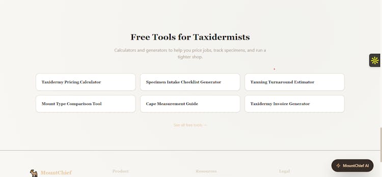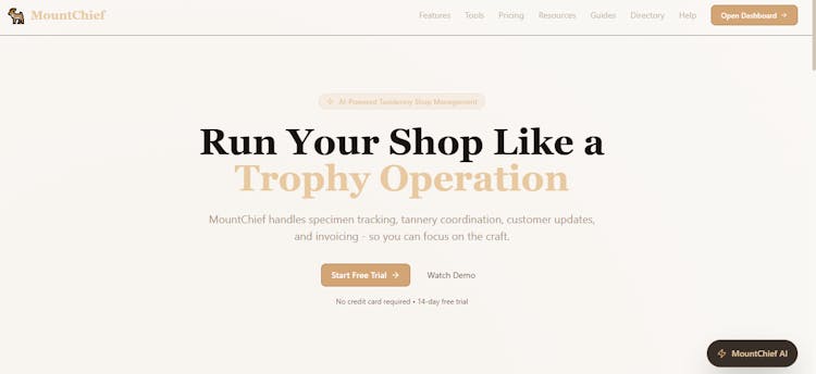MountChief is an AI-driven platform for taxidermy shops, simplifying specimen tracking, tannery coordination, invoicing, and client communication to improve efficiency and provide a seamless, professional experience.For more details visit: mountchief.com