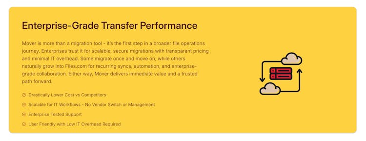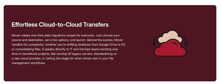 Mover is the ultra-reliable, cost-effective tool for one-time data migrations. Effortlessly transfer files between cloud and on-premises systems with transparent pricing as low as $0.15 per GB—no subscriptions, no hidden fees, just seamless migration.