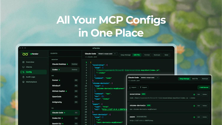 Free, open-source desktop app that auto-detects every AI client on your machine — Claude Desktop, Cursor, Windsurf, VS Code and more. Manage all your MCP server configs in one place, install from the marketplace, and back up with one click. macOS, Windows & Linux.