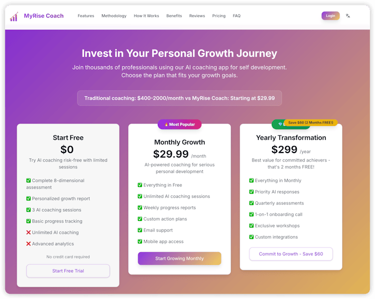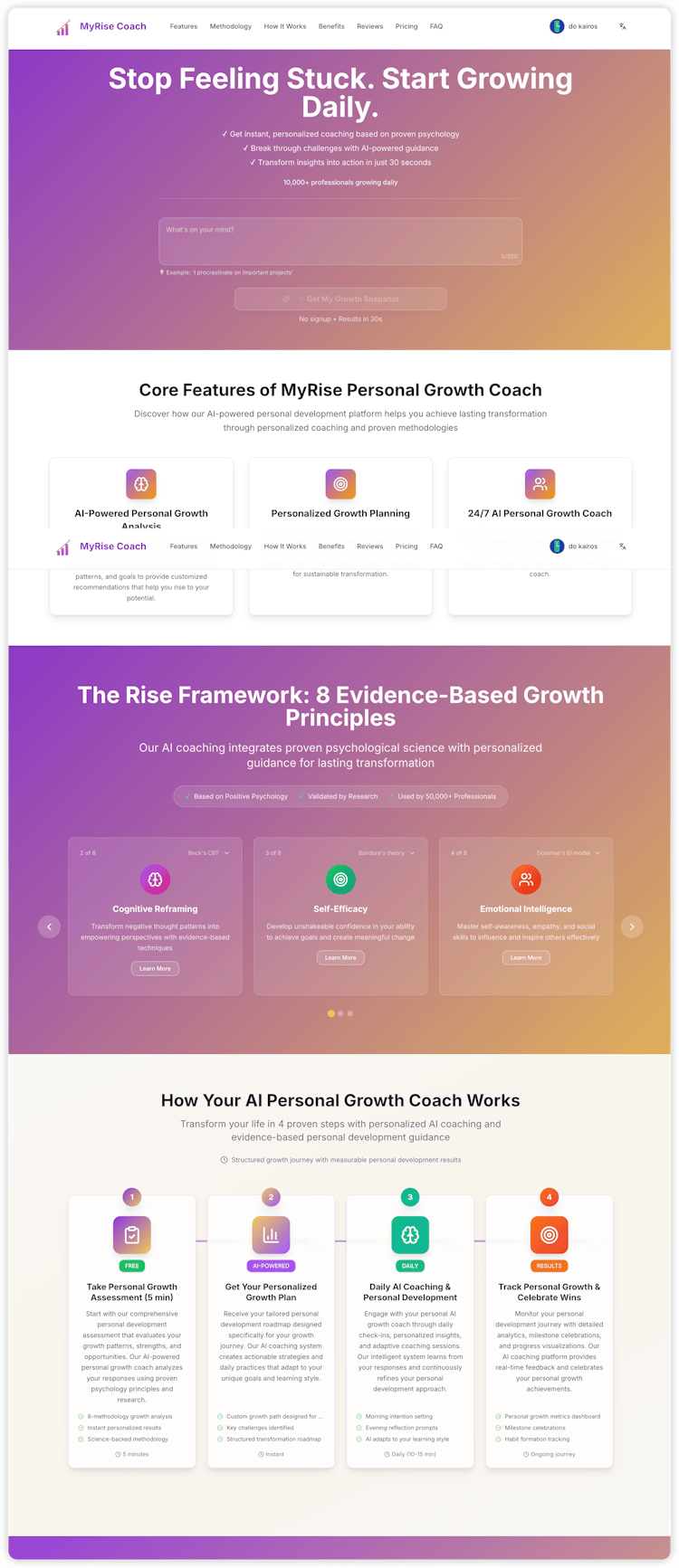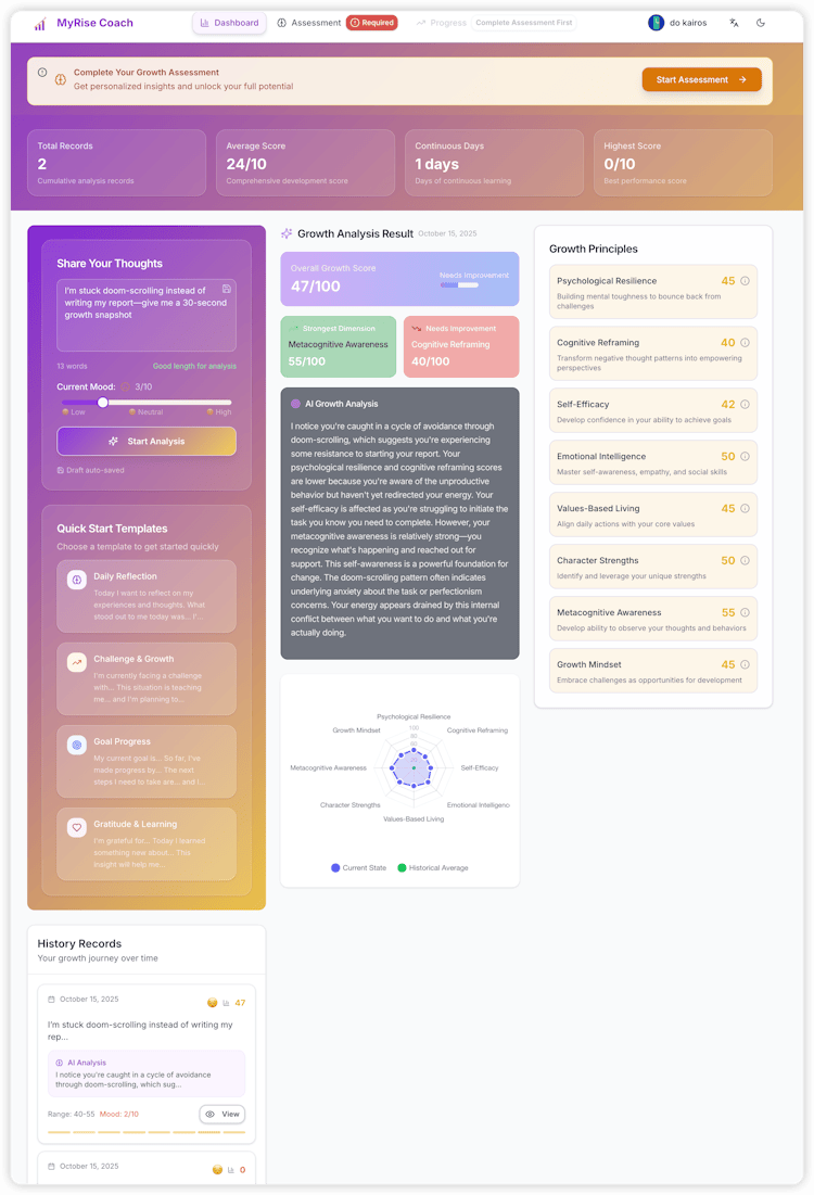 MyRise Coach is an AI-powered personal growth coach built for high-performing developers and creators. It analyzes your thoughts and behaviors to create a personalized 12-week roadmap for confidence, leadership, and resilience. With daily AI check-ins, evidence-based methods, and real-time progress tracking, you can transform your mindset and reach peak performance — just like optimizing your code.