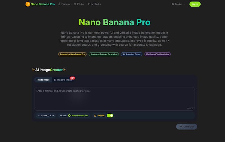 Nano Banana Pro: Generate hyperrealistic 4K images. Get precise color, total control, and flawless rendering of people, interfaces, and text. Where AI blurs with reality.