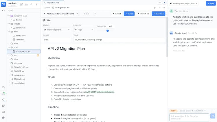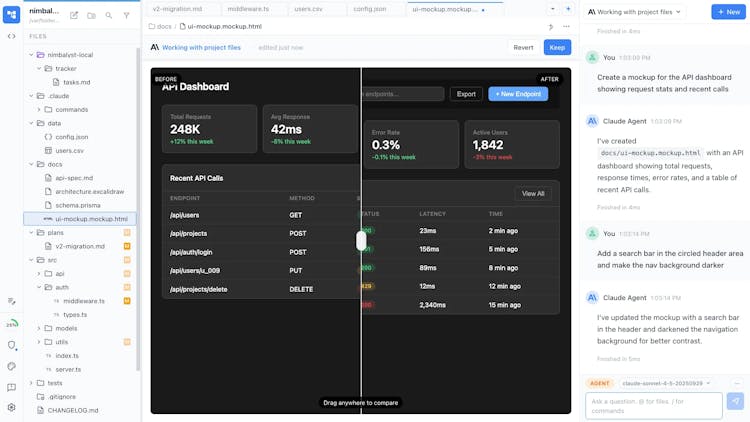 Maximize the bandwidth of your collaboration with your agents in Nimbalyst's visual workspace. Nimbalyst is the session manager and visual editor for markdown, mockups, drawings, sessions, and tasks.