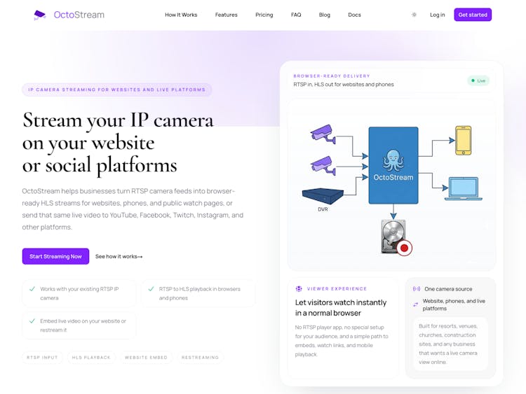 OctoStream is a live camera streaming platform that makes it simple to publish a live video feed from any IP camera directly to the web - without managing servers or asking viewers to download anything.