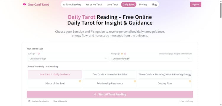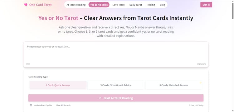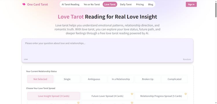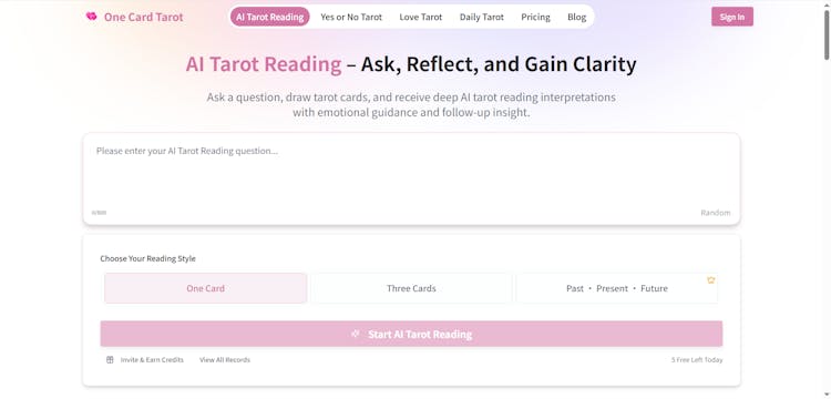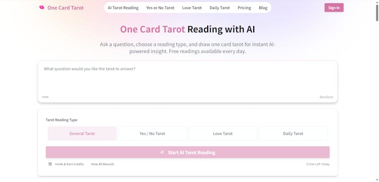 One Card Tarot is an AI-powered tarot reading tool that lets you ask a question, draw a single tarot card, and receive instant interpretations for guidance, reflection, and daily insight.