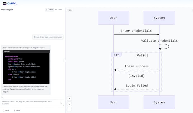 OnUML is a lightweight, browser-based diagramming tool focused on Mermaid.js, enhanced with AI-assisted chat input. Designed for developers, technical writers, and software architects, it simplifies the creation of UML diagrams and flowcharts through natural language prompts and real-time rendering. It is a great UML diagram tool, allowing real-time UML preview. You can use it as an AI UML generator.