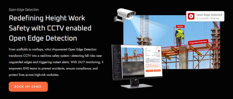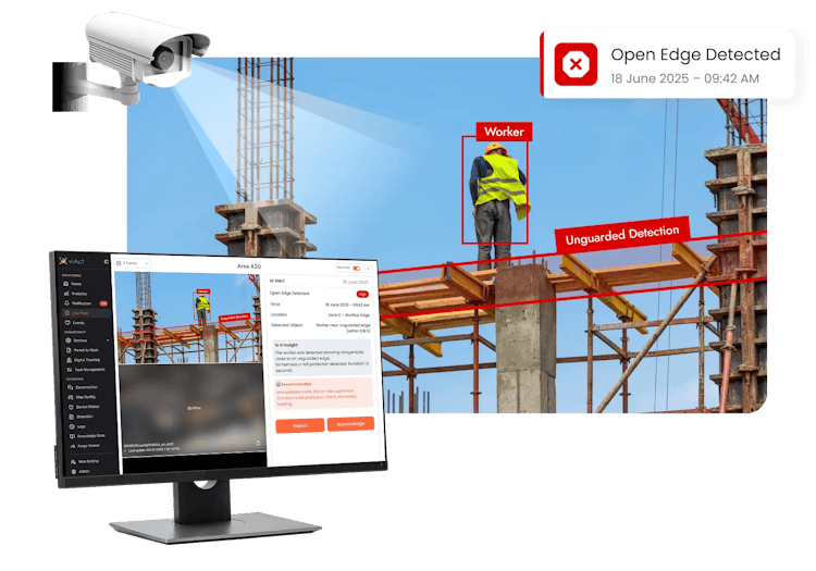 viAct’s AI-Powered Open Edge Detection module is designed to transform safety at height. Using computer-vision based analytics, it allows CCTVs and IP cameras on site to instantly detect any unprotected edges without any human intervention.