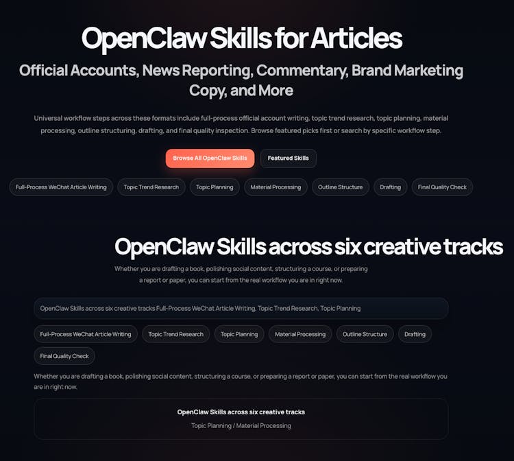 A curated OpenClaw skills directory that helps authors and content creators discover relevant skills by task and workflow stage.