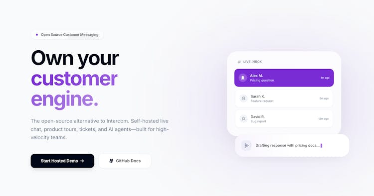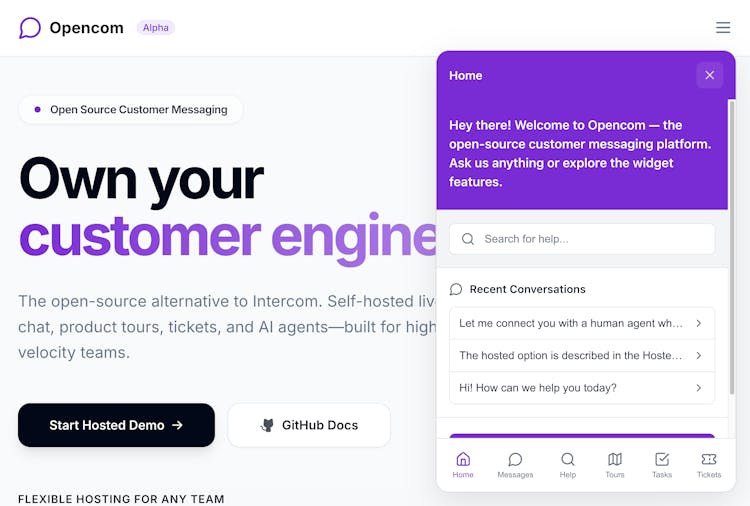 Opencom is a customer engagement platform like Intercom, aiming for feature parity. Shared inbox, Product tours, outbounds, push notifications, surveys, and more.