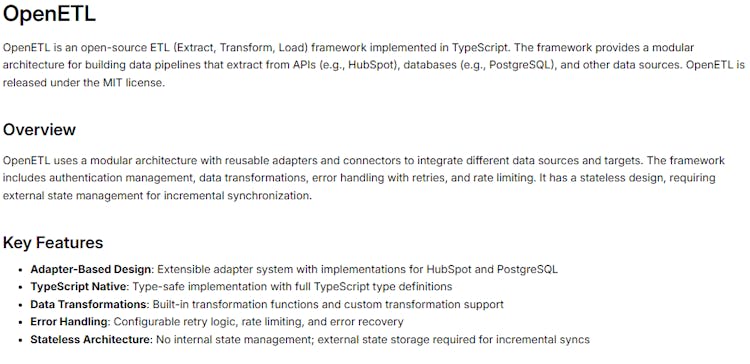 OpenETL is an open-source ETL (Extract, Transform, Load) framework implemented in TypeScript. The framework provides a modular architecture for building data pipelines that extract from APIs (e.g., HubSpot), databases (e.g., PostgreSQL), and other data sources. OpenETL is released under the MIT license.