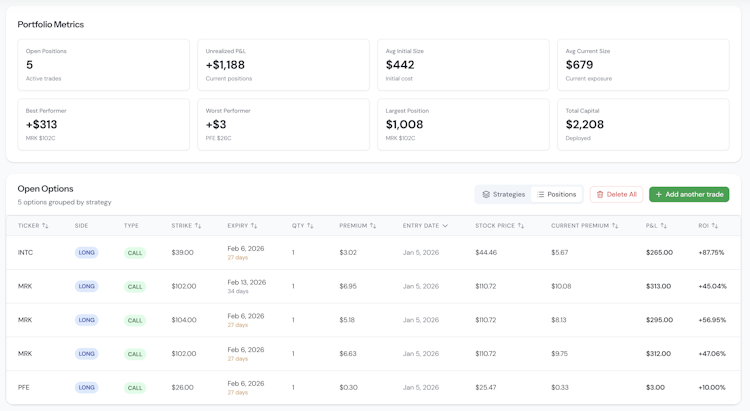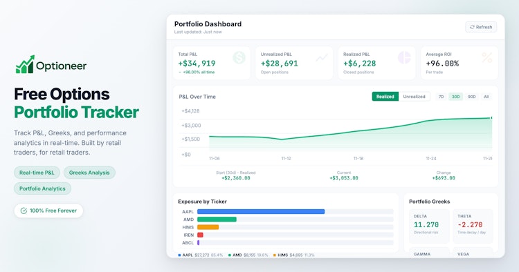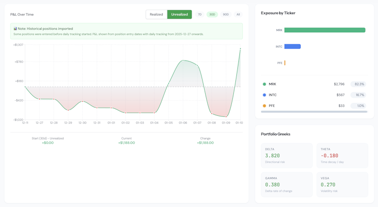 Track your options portfolio with real-time P&L, Greeks, and performance analytics. Free forever. Built by retail traders, for retail traders.