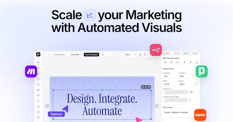 Design once, integrate via API, and automate high-volume social, e-commerce, and other marketing images, PDFs and videos from your data at scale